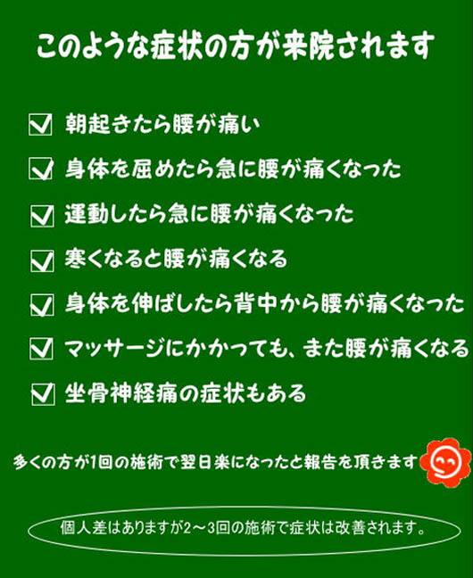 筋肉をほぐし、コリを取ることによって(マッサージ)、血行が良くなりリラクゼーション効果もあり、またカイロで骨格、骨盤矯正などをすればその場で骨の位置は正常に戻ります。 ただ、なぜ「歪んだのか?」を考えないと、あなたの身体の歪みは、「歪んだくせ」によって長い年月をかけて出来たものなので、ポキっと1回や2回、ましてや10回やっても20回やっても、また数時間後には全く元通りに戻ってしまいます。 当院のオリジナル整体は従来の骨格矯正やマッサージなどの手技とは全く異なります。